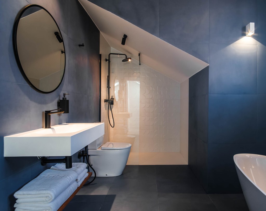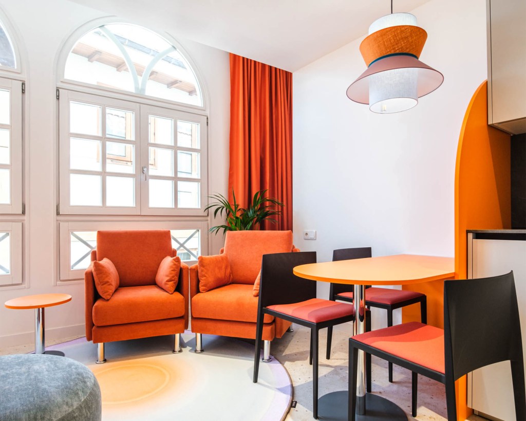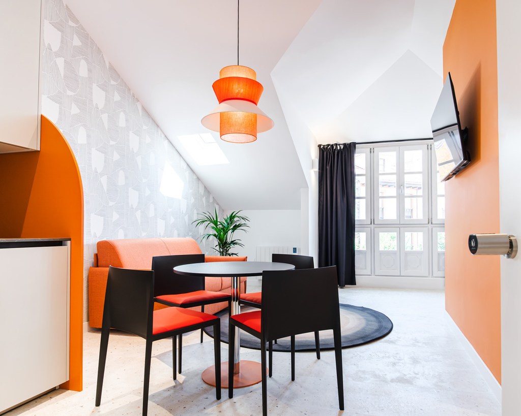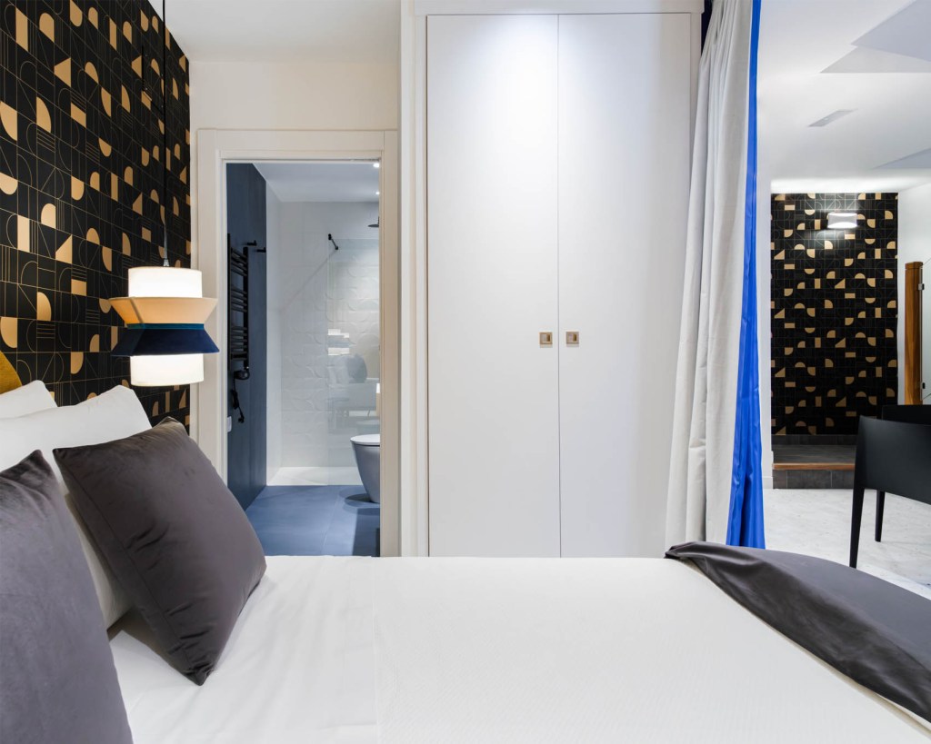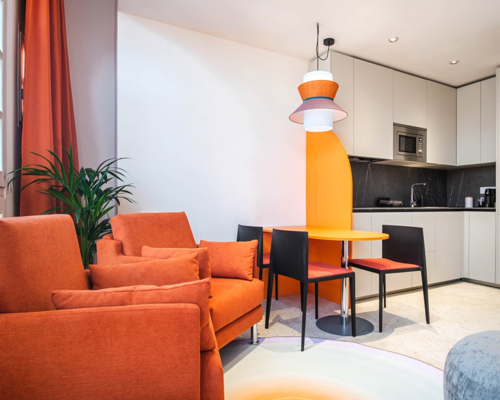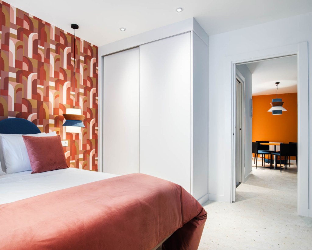 En el ático del edificio se encuentra el Apartamento Pleamar, es el más grande y luminoso con vistas a la Torre del Reloj y al mar. El mobiliario usado en todos los apartamentos es sofá cama de Le Confort, butacas Hug, alfombras Luz, puf Ghianda, cabeceros y mobiliario bicolor diseño de Miguel Reguero, lámparas también de nuestro diseño para Peralta, sillas de Andreu World y mobiliario de cocina de Santos.